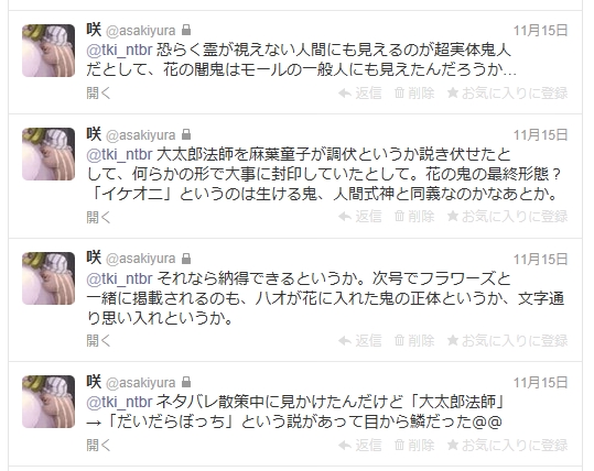 取り敢えず忠具様亡き後の麻葉さん(ちゃん付けできない)が麻薬をうってかわってしまった(コピペbotネタ)のが楽しかったのと回想を語り終えた後の双葉会話が至福だったのとあと何より葉が可愛かった。葉が可愛かった。何より可愛かった。大事なことなので三度言いました。